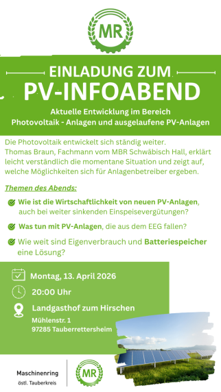 Als Referent wird Thomas Braun, Fachmann vom Maschinenring Schwäbisch Hall, erwartet. Er wird die derzeitige Situation auf dem PV-Markt erläutern und aufzeigen, welche Chancen und Herausforderungen sich für Anlagenbetreiber ergeben.